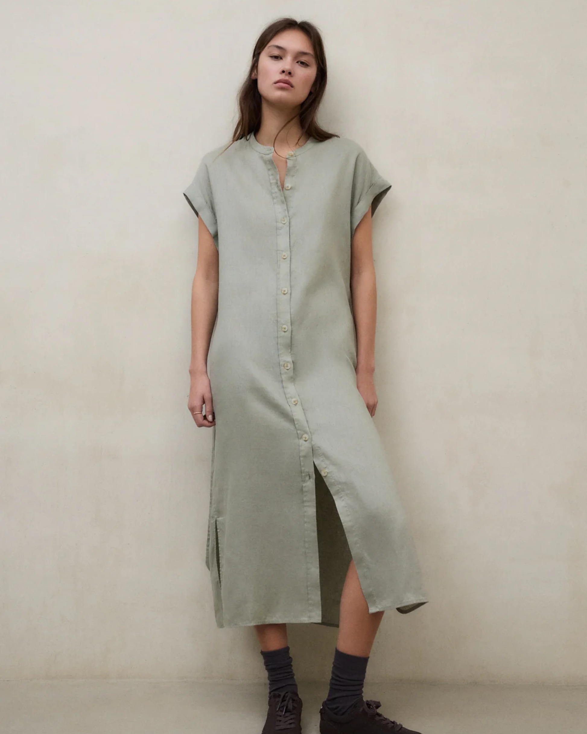 El Vestido Amatista está confeccionado con un tejido principal de 80% lino, ligero y transpirable, ideal para los días cálidos. Presenta un fit regular que ofrece comodidad y una silueta equilibrada. El diseño se completa con mangas cortas, cuello mao y bolsillos insertados en las costuras laterales, aportando un toque práctico y natural al estilo. 80% lino.