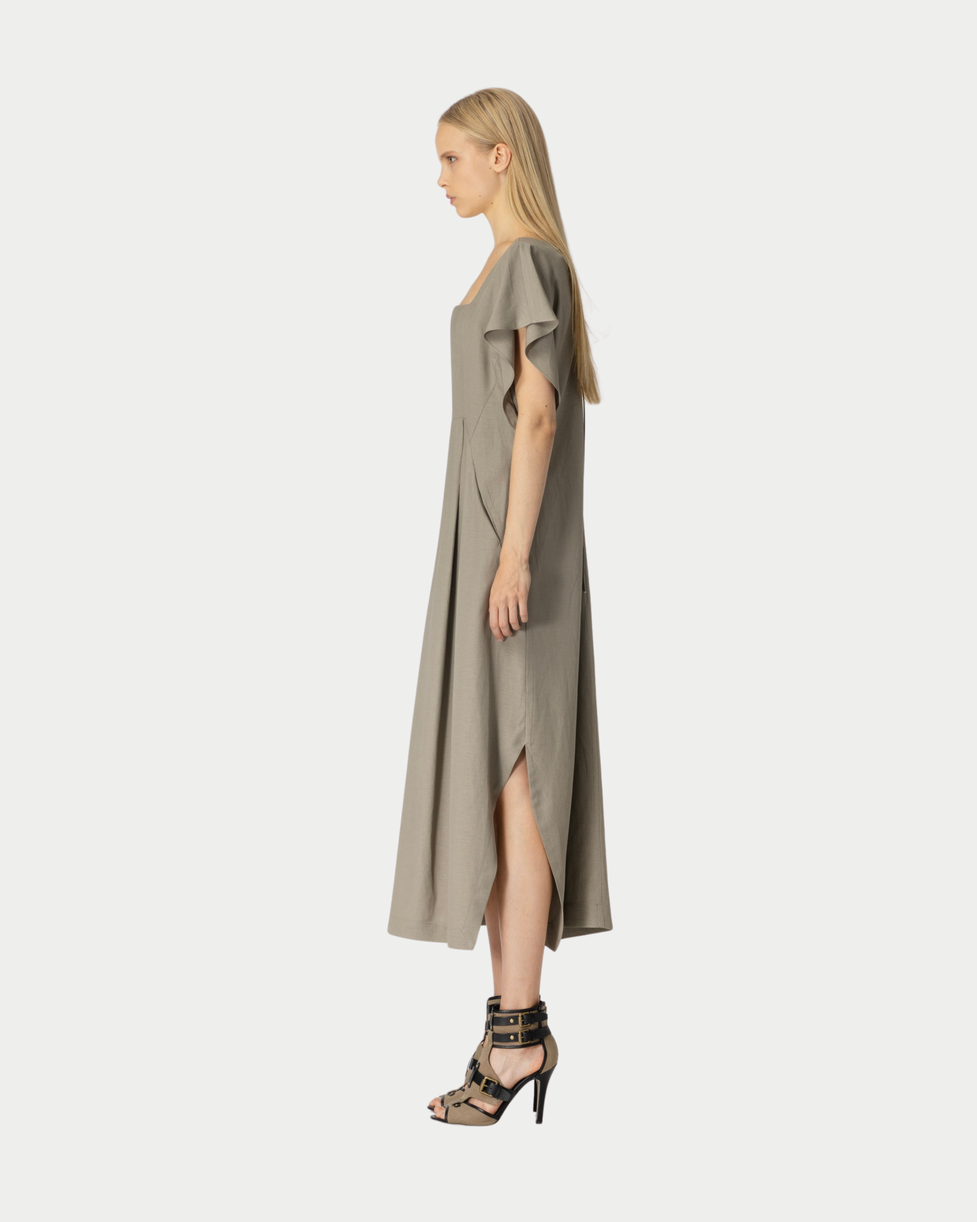 Abito in viscosa e lino che unisce eleganza e comfort. La miscela di fibre naturali garantisce una drappeggiatura fluida e una traspirazione ottimale, perfetta per una silhouette sofisticata. Ideale per occasioni formali e per l'uso quotidiano, questo capo si distingue per la qualità dei materiali e la versatilità di stile.