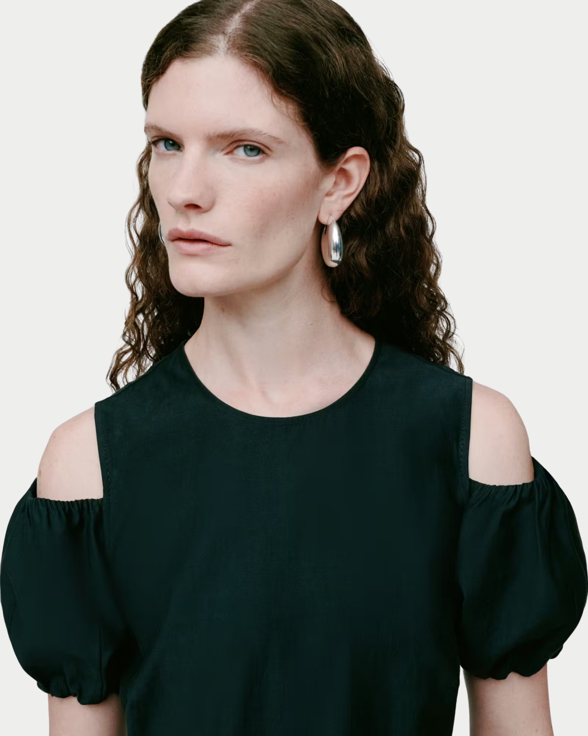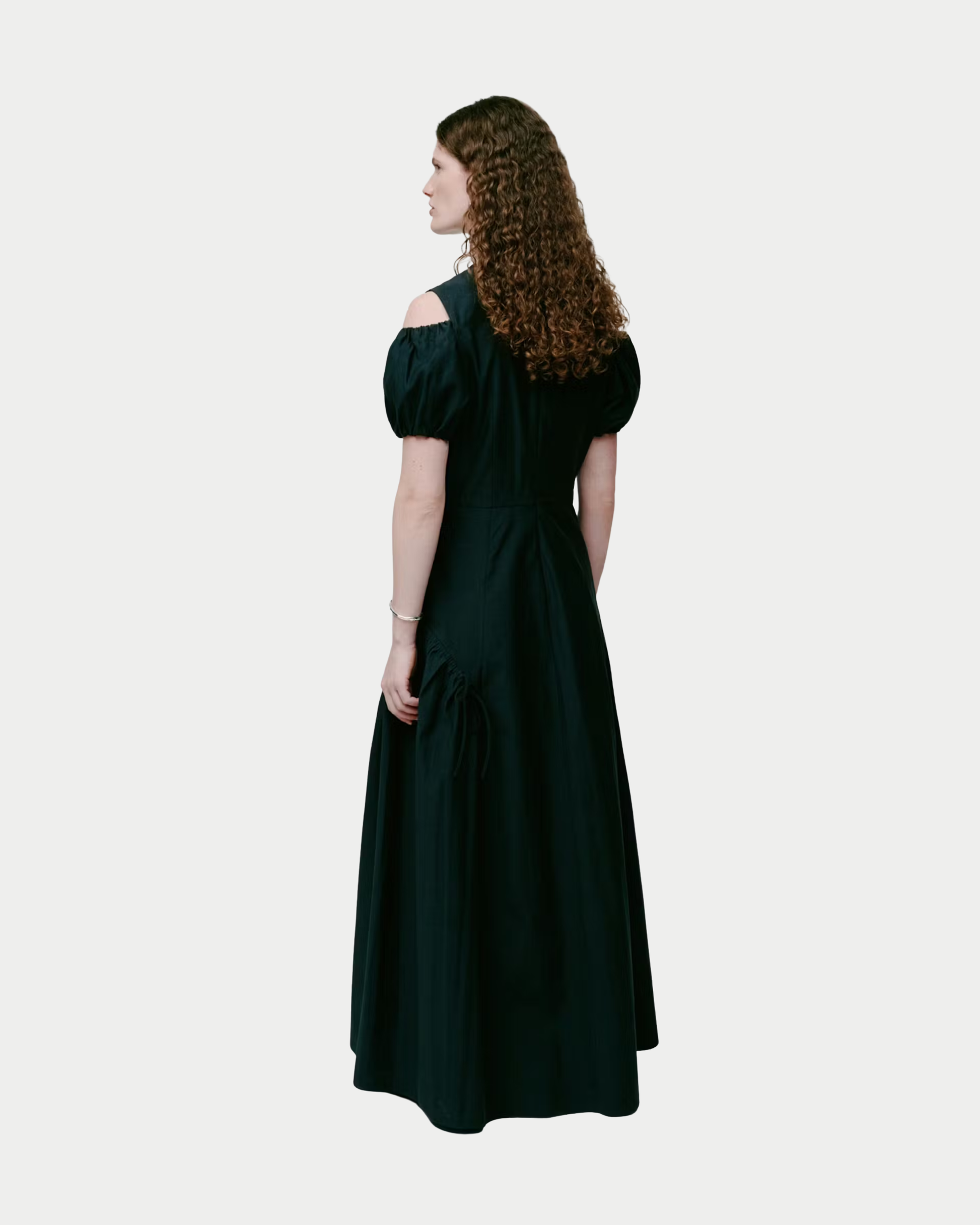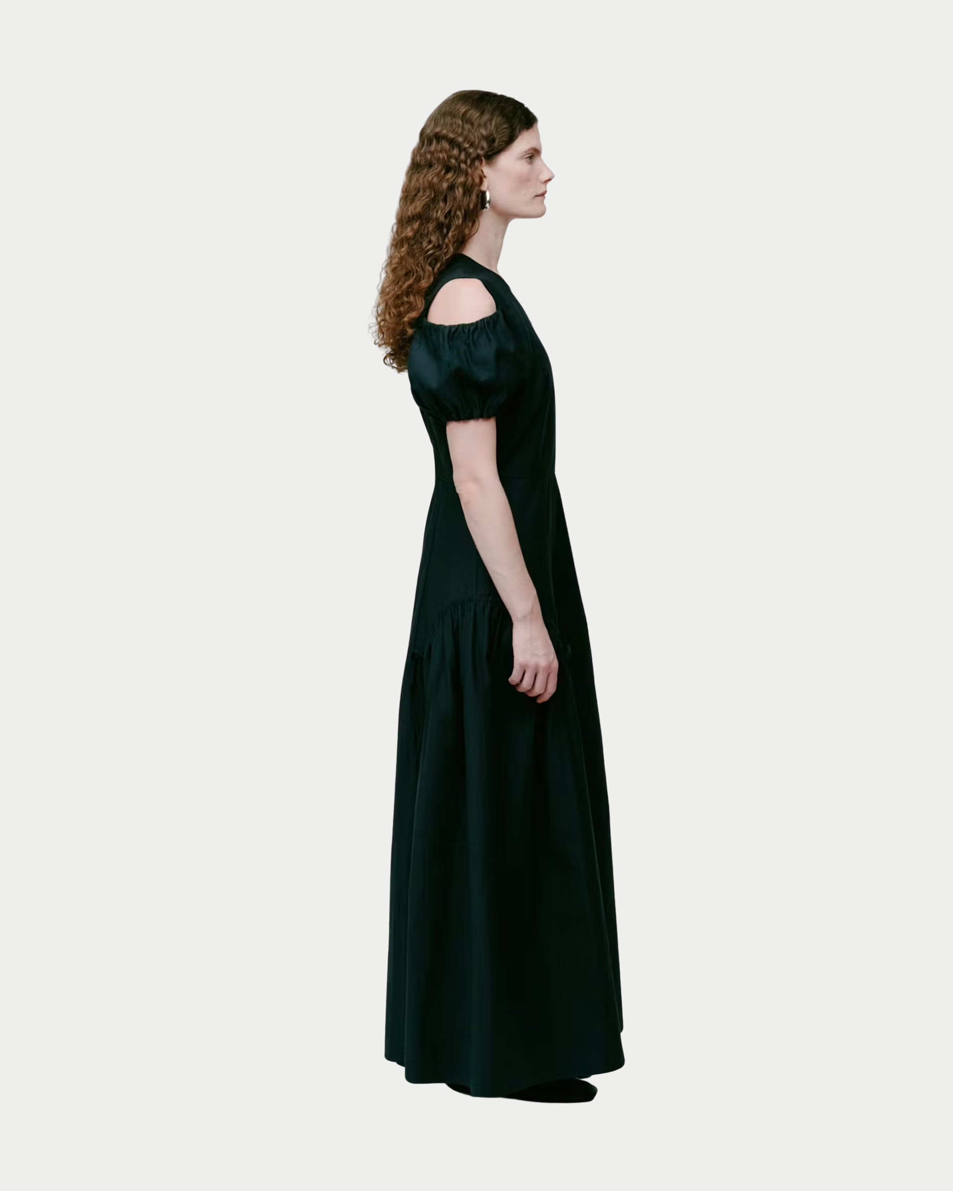 Abito maxi dalla linea dritta con spalle strutturate cut-out e maniche corte a sbuffo. Collo alto tondo e gonna con leggere arricciature definiscono una silhouette moderna, equilibrata da una texture raffinata.