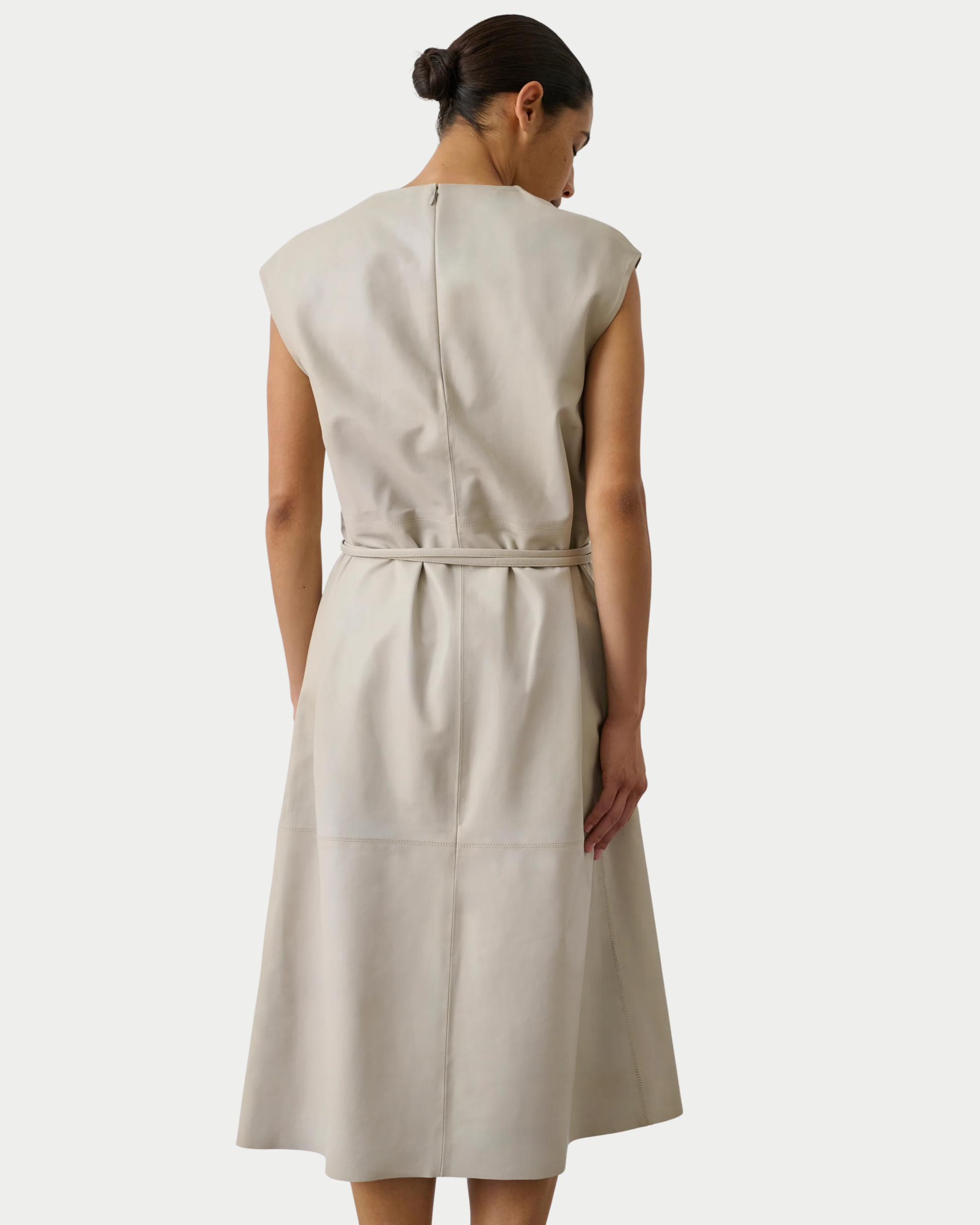 Abito midi dal taglio dritto con scollo rotondo e impunture a vista. La chiusura con zip e gancio sul retro assicura una vestibilità pulita ed elegante. Realizzato in 100% pelle di agnello certificata LWG, è un capo essenziale dal carattere moderno e sofisticato.