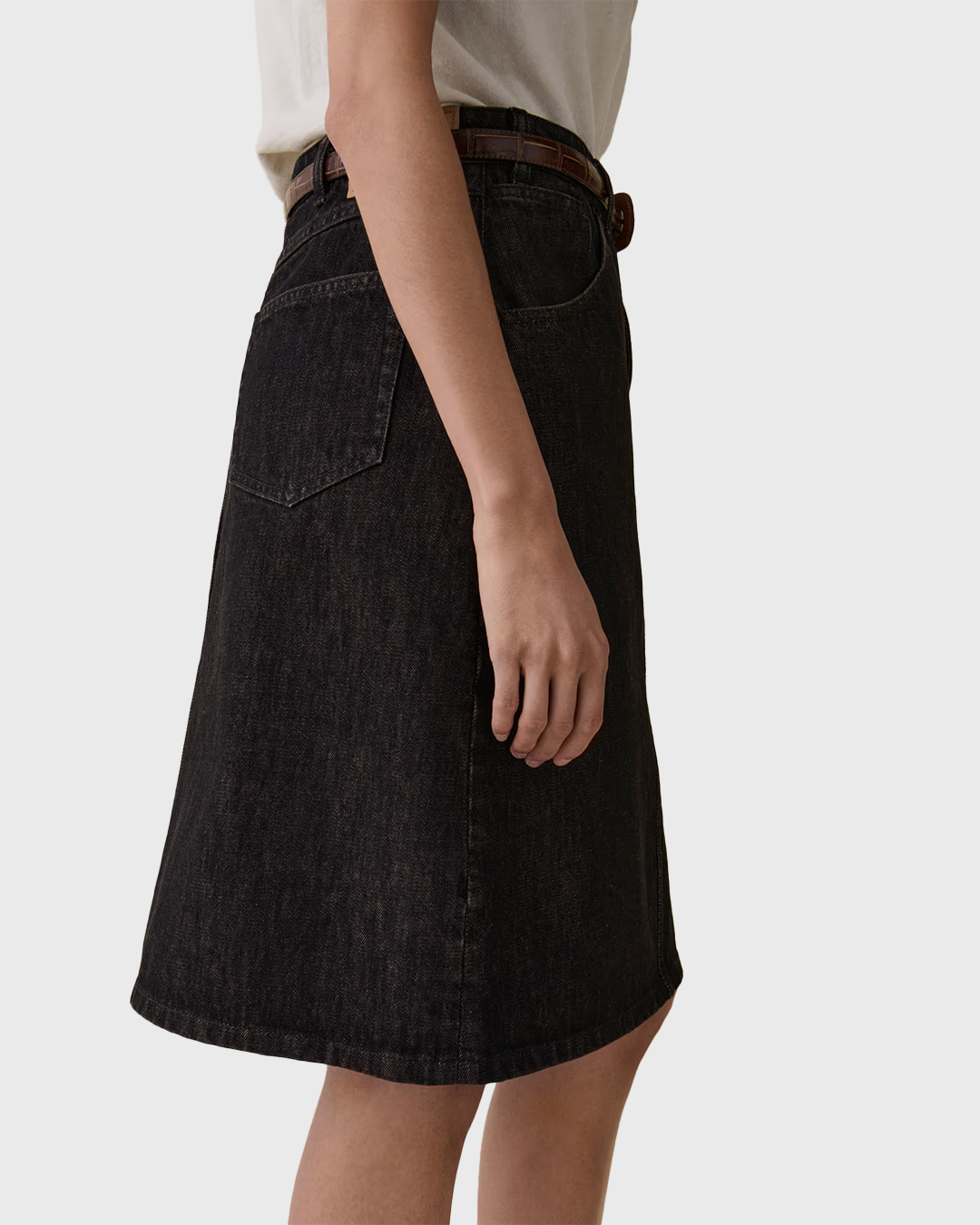 Gonna in denim a vita media, lunghezza al ginocchio e sagoma leggermente a trapezio. La linea leggermente svasata crea una silhouette raffinata, elegante nella sua semplicità e perfetta per look casual-chic.