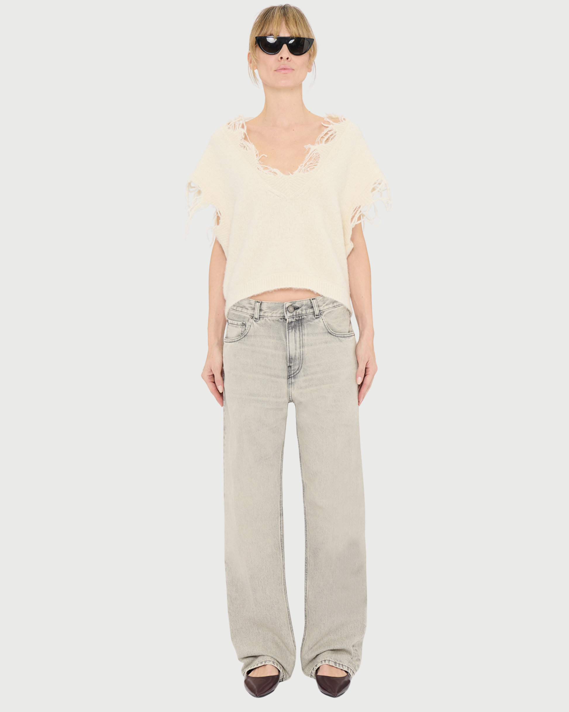 Jeans a gamba larga in denim di cotone grigio perla con effetto slavato. Dotato di passanti in vita, chiusura con zip e bottone, cinque tasche classiche e cuciture a vista. Completato dal patch logo sul retro, per un look rilassato e contemporaneo.