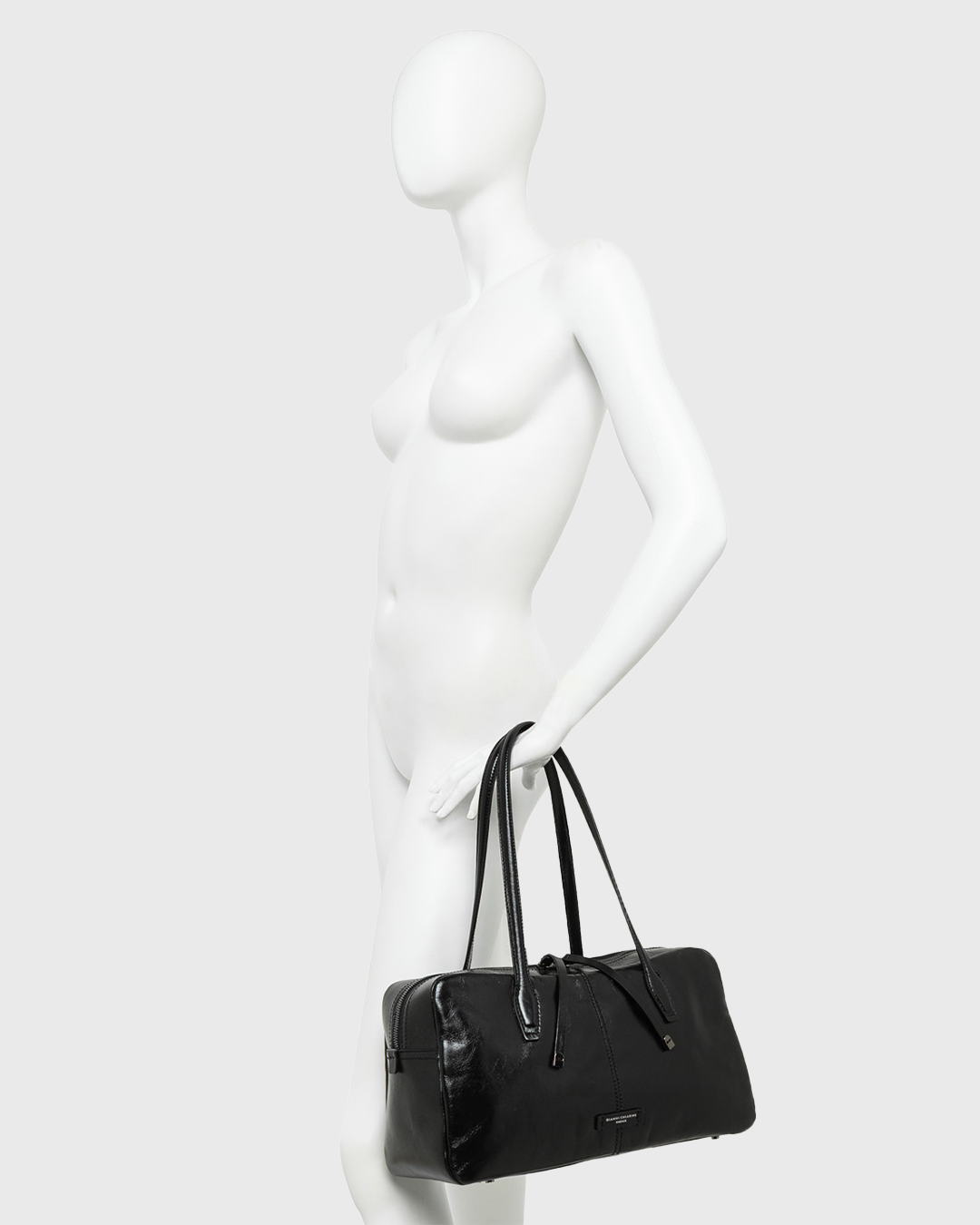 Borsa a mano in pelle effetto vintage, dallo stile sportivo ma sempre femminile. Dotata di doppia zip con tirazip in metallo e arricchita da rivetti logati, unisce praticità e carattere. I due manici superiori garantiscono una portabilità comoda e chic. Dimensioni: 38x20x14 cm.
