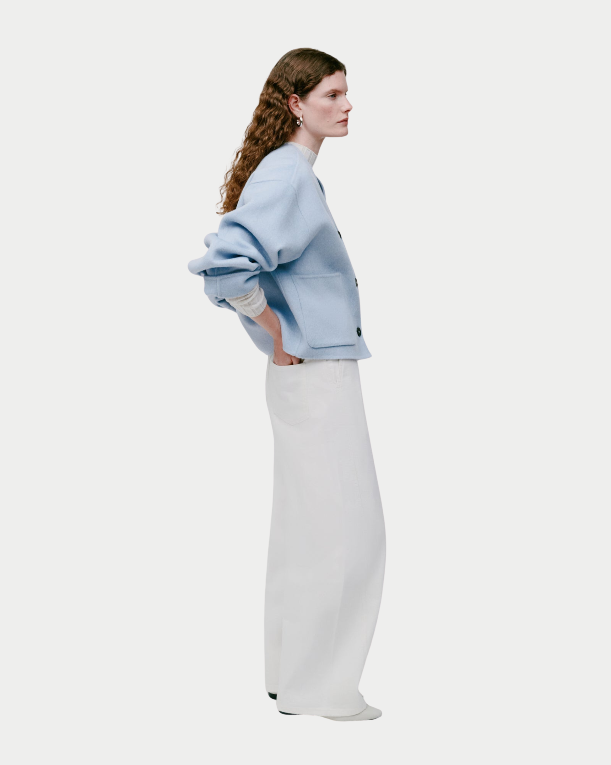 Jeneva è una giacca boxy cucita a mano, realizzata in pregiata lana double-face. Può essere indossata sia come capospalla leggero sia come giacca da interno. Presenta una profonda scollatura, maniche ampie e una chiusura frontale con bottoni.