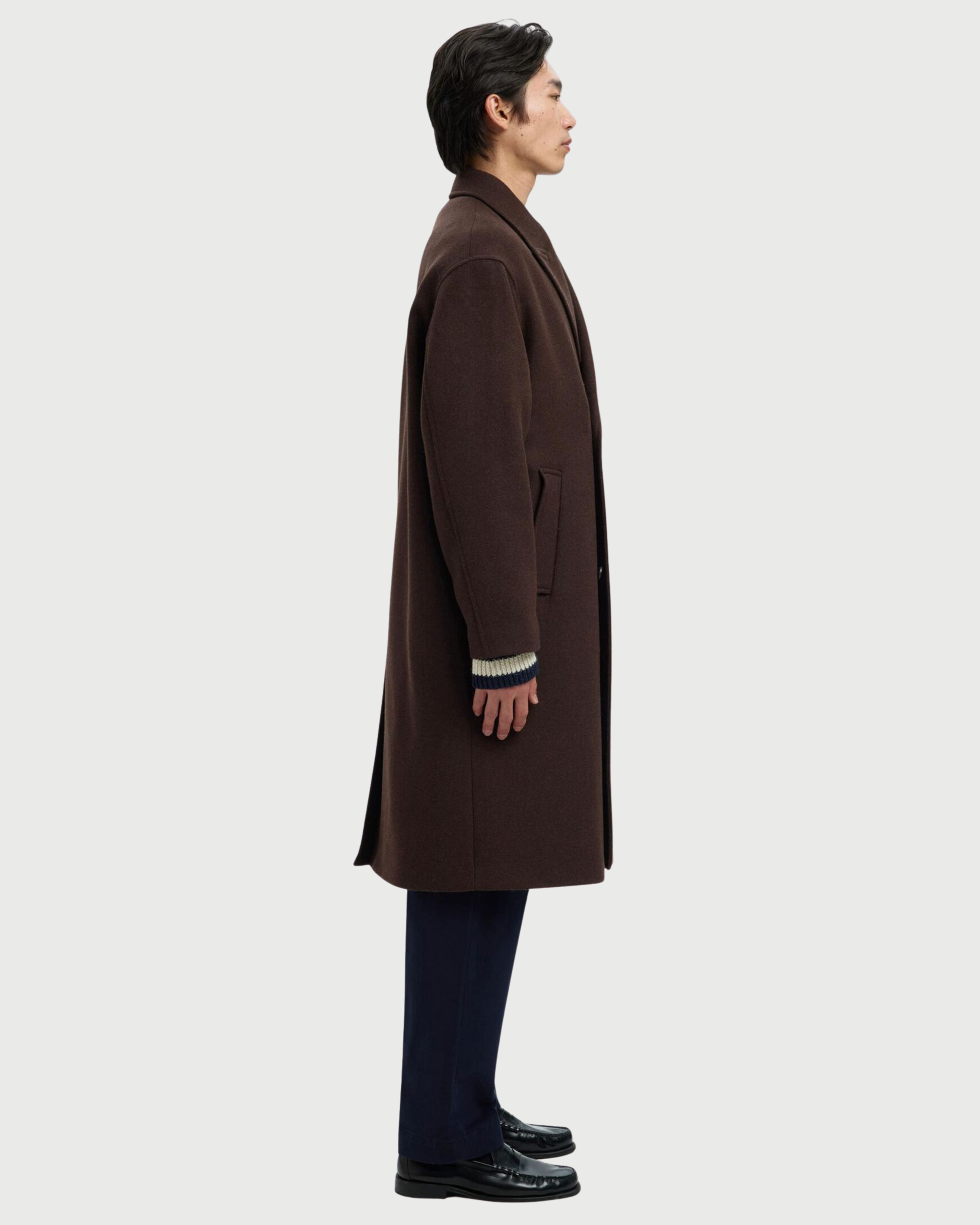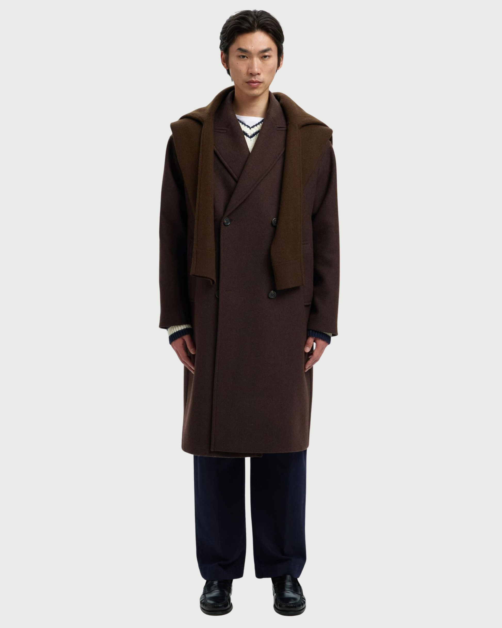 Cappotto doppiopetto in misto lana che unisce eleganza classica e stile contemporaneo. Realizzato con tessuti Manteco, azienda italiana rinomata per la qualità dal 1943, offre una vestibilità moderna e leggermente rilassata ispirata alla sartoria. Le spalle scese, il rever classico e le tasche a filetto aggiungono un tocco raffinato. Un capo caldo e versatile, perfetto sopra un completo o per elevare i look quotidiani con discreta sofisticazione.