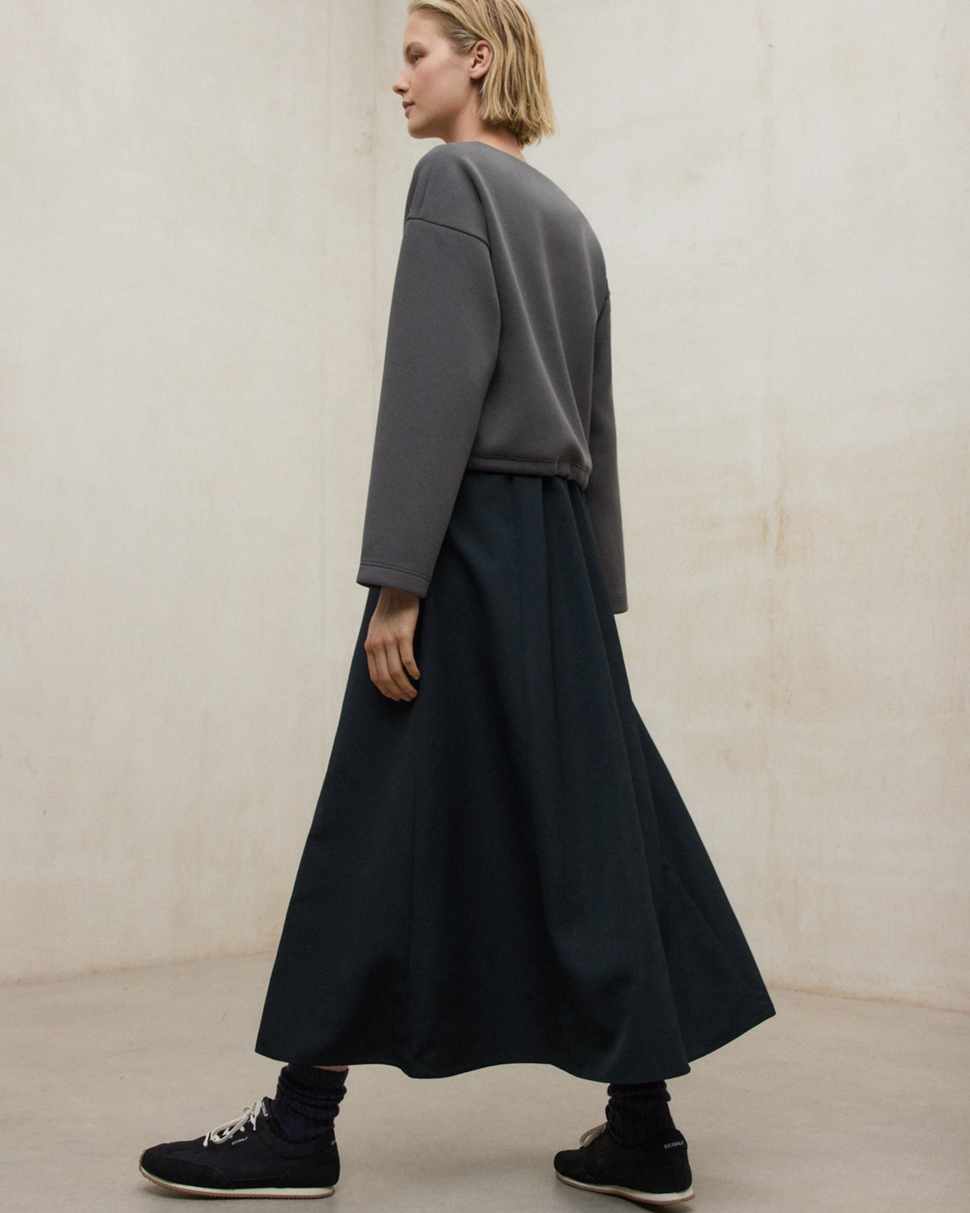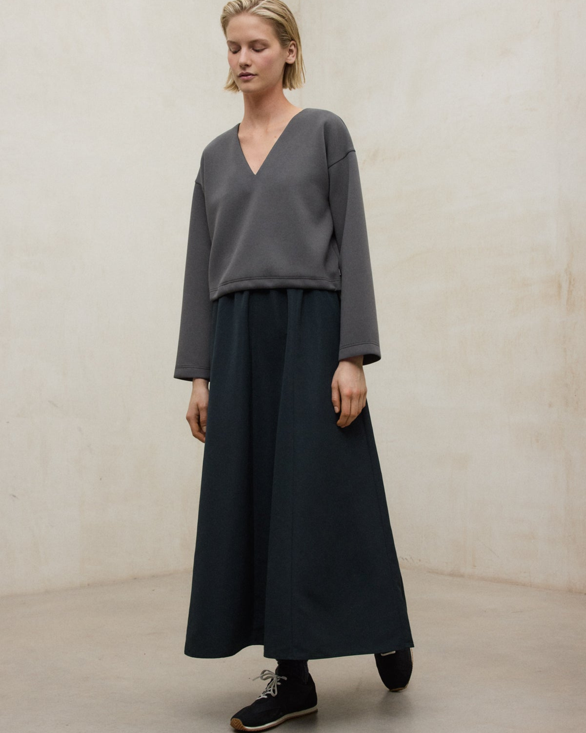 Abito dal taglio rilassato in poliestere riciclato Tex2Tex con vita regolabile ed elastico. Linea morbida con scollo a V e tasche laterali, realizzato con energia 100% rinnovabile e materiali sostenibili.