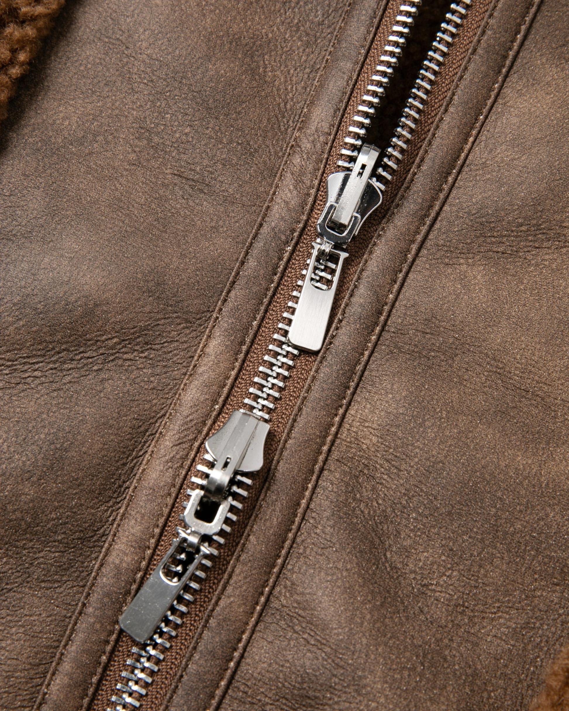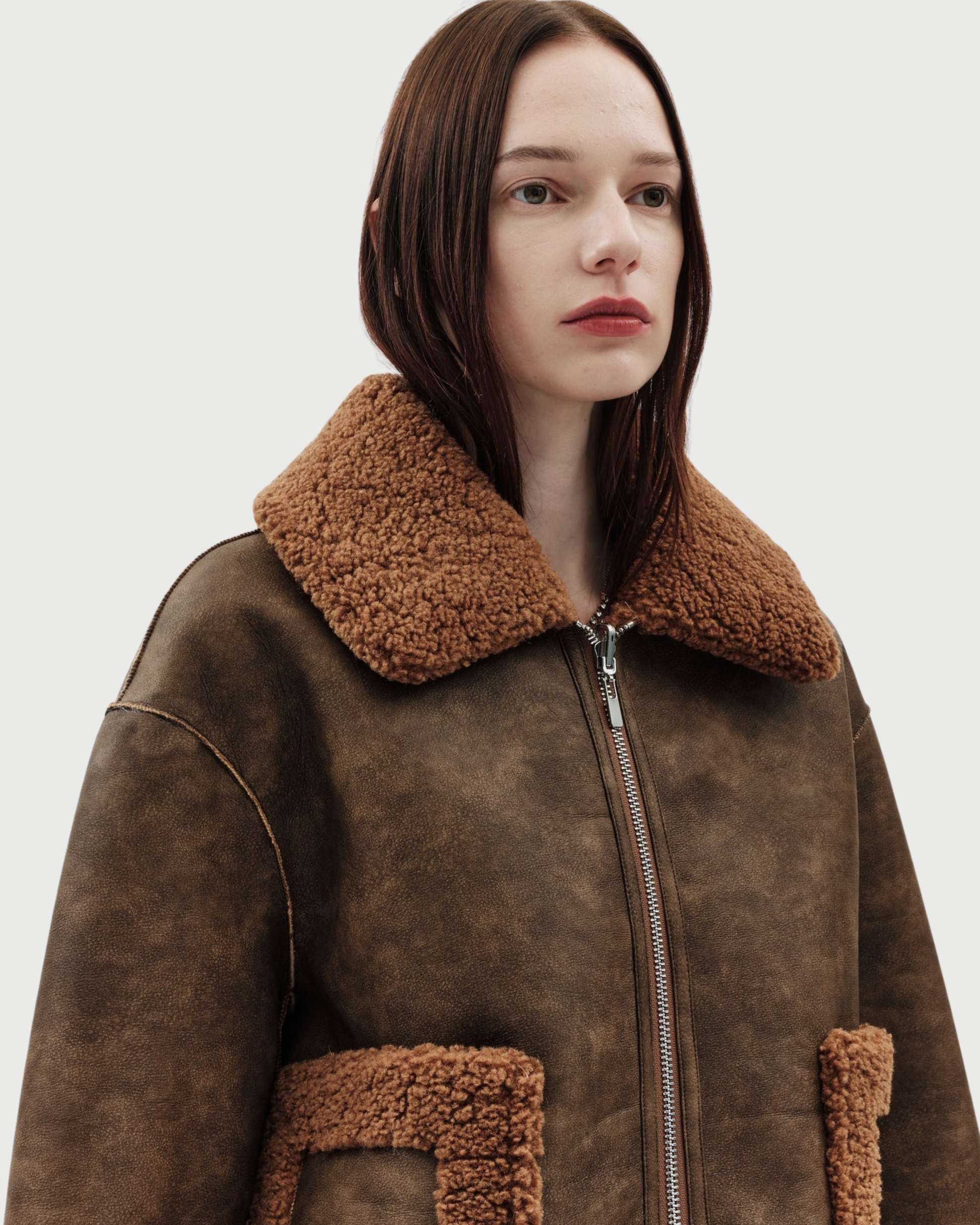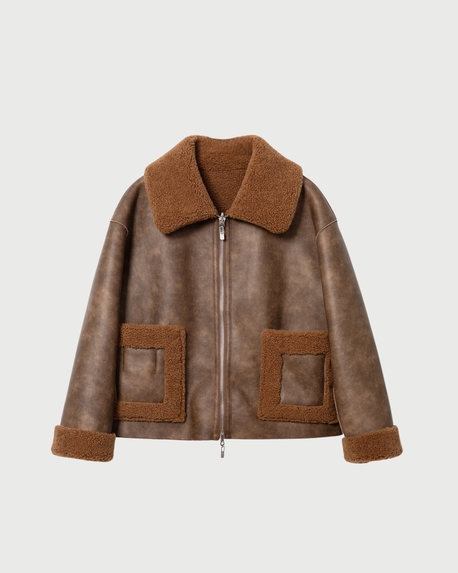La giacca Vera è completamente reversibile e può essere indossata dal lato in morbido shearling sintetico o da quello in ecopelle liscia. Il taglio è dritto e boxy, con chiusura a zip doppio cursore e tasche esterne su entrambi i lati.