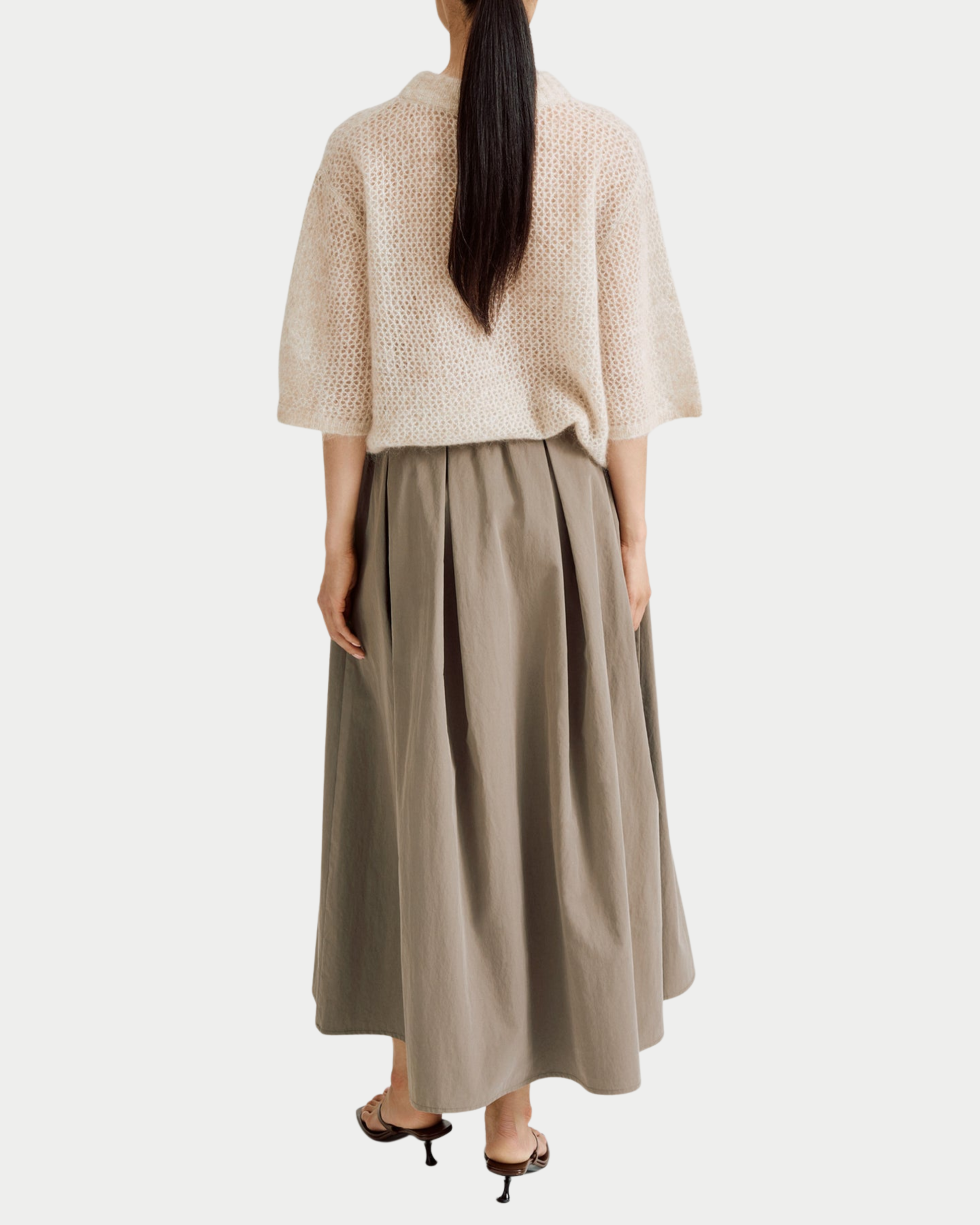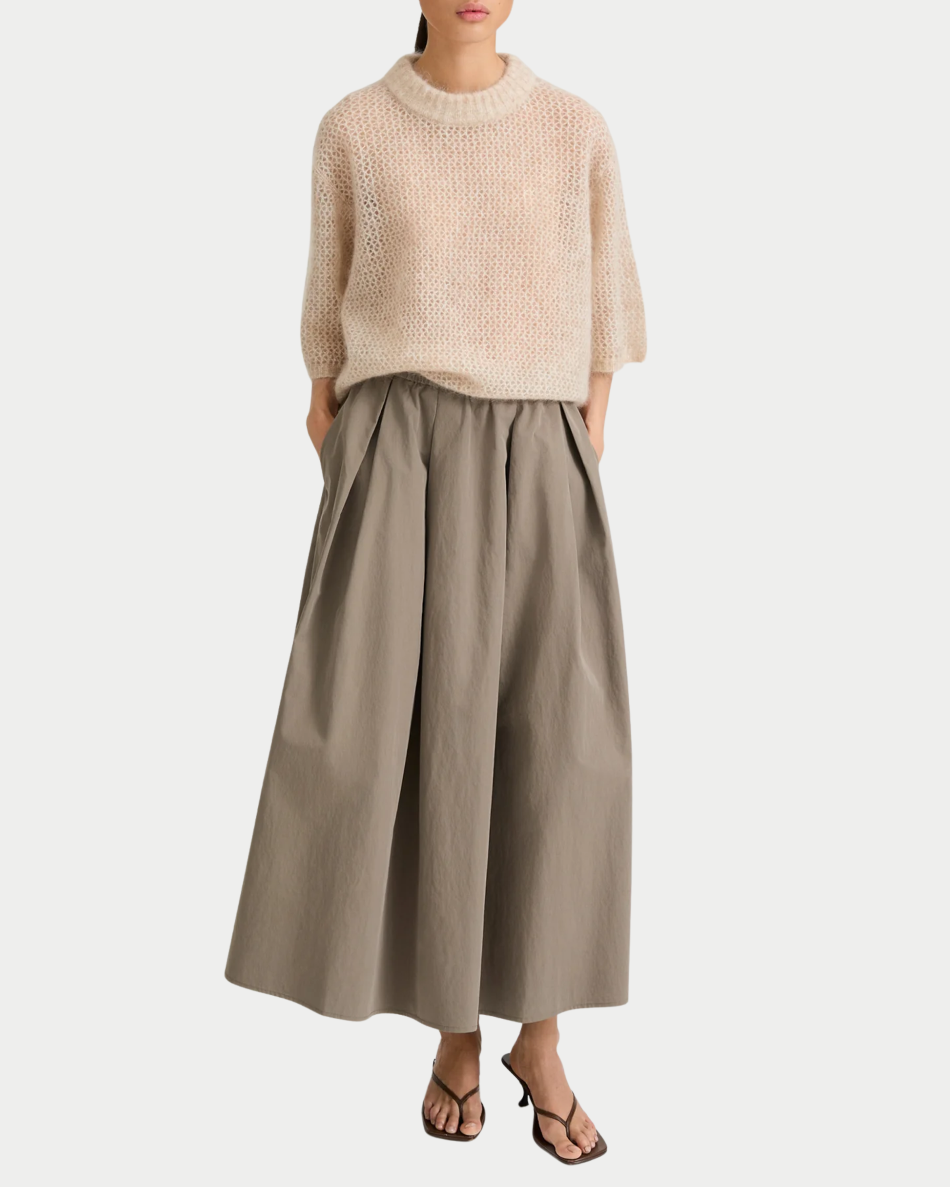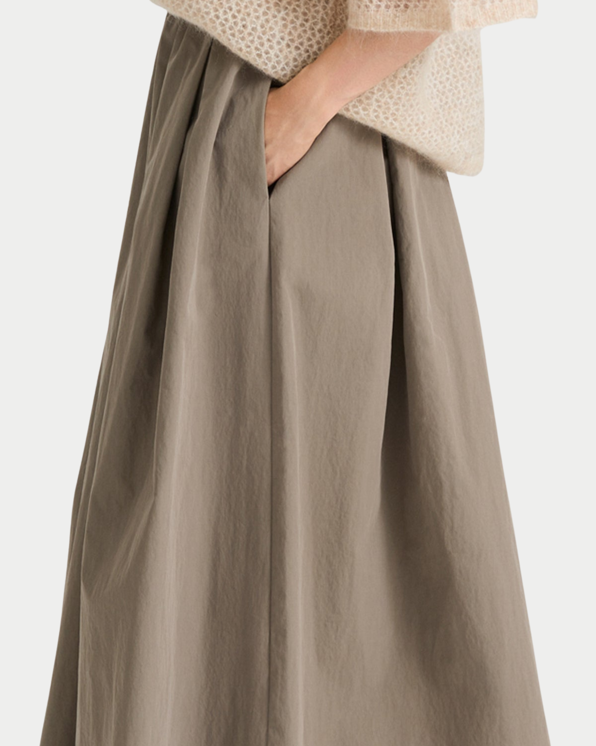 Sorina è una gonna maxi in tessuto strutturato misto cotone dal feel trench. Le pieghe a scatola davanti e dietro creano volume elegante, mentre le tasche laterali e la vita pulita con elastico nascosto assicurano comfort e praticità.