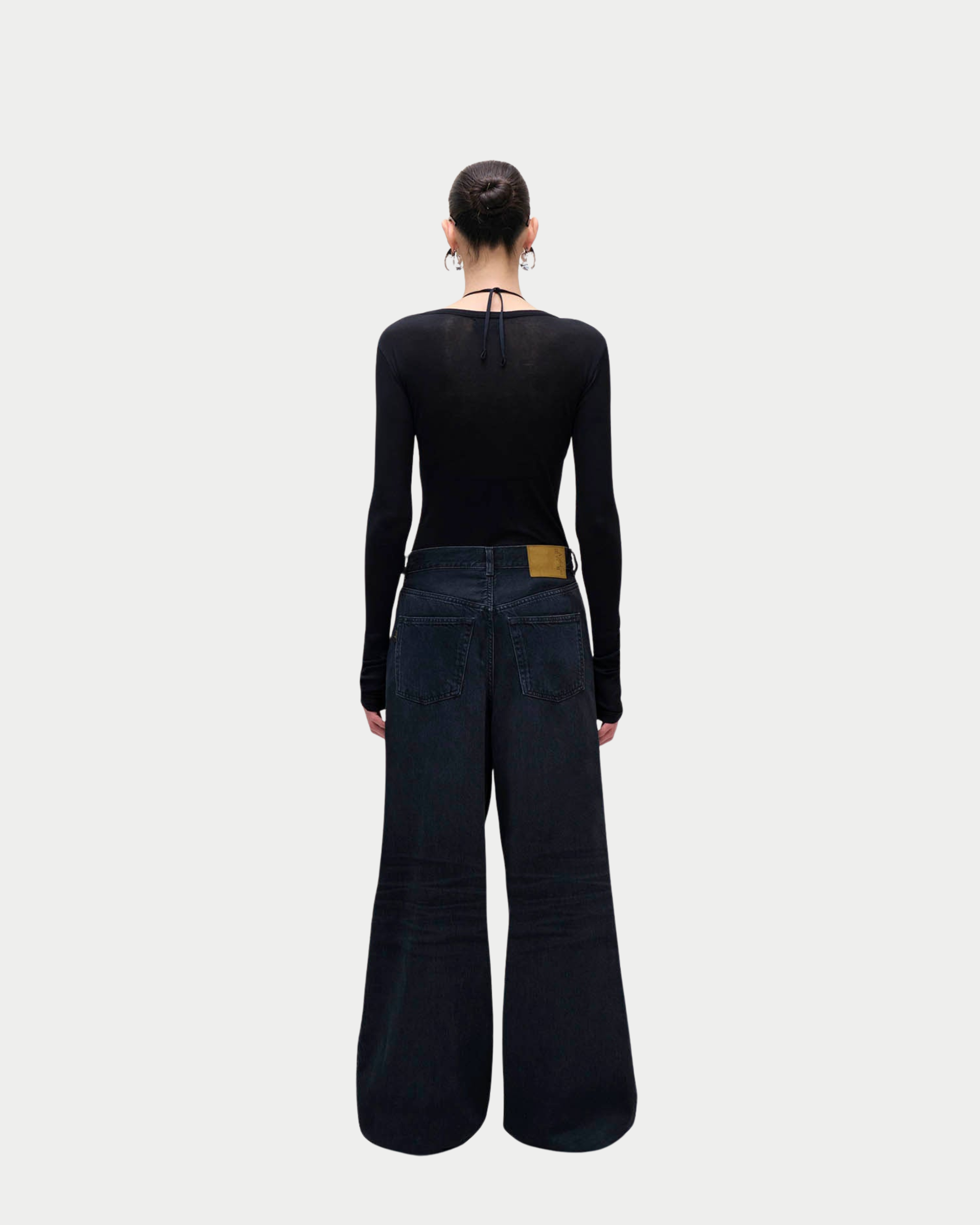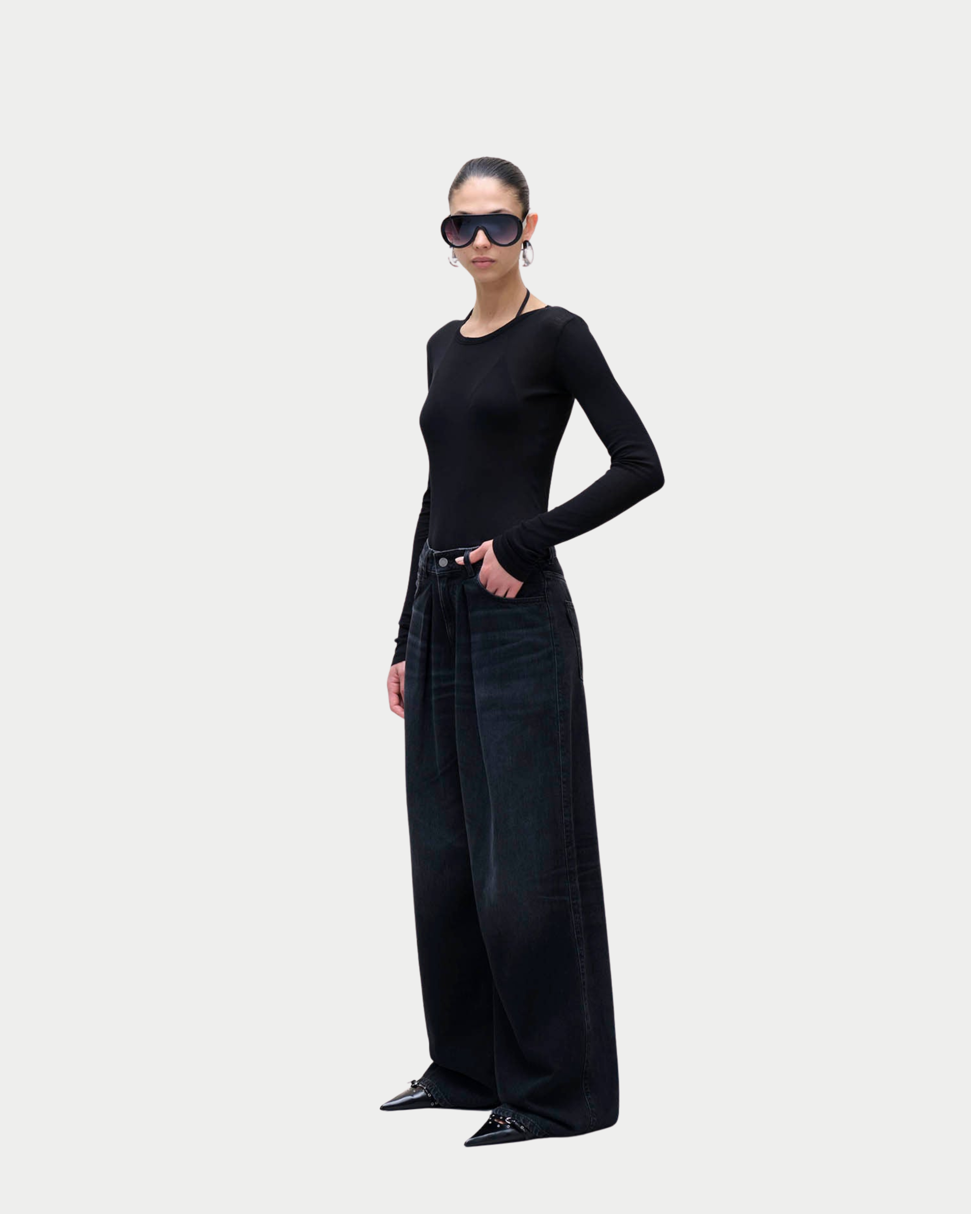 Pantaloni in denim, caratterizzati da pieghe frontali che costruiscono una silhouette architettonica e voluminosa. Dona movimento e leggerezza, mantenendo una struttura elegante e contemporanea. Un modello distintivo, pensato per look moderni e raffinati.