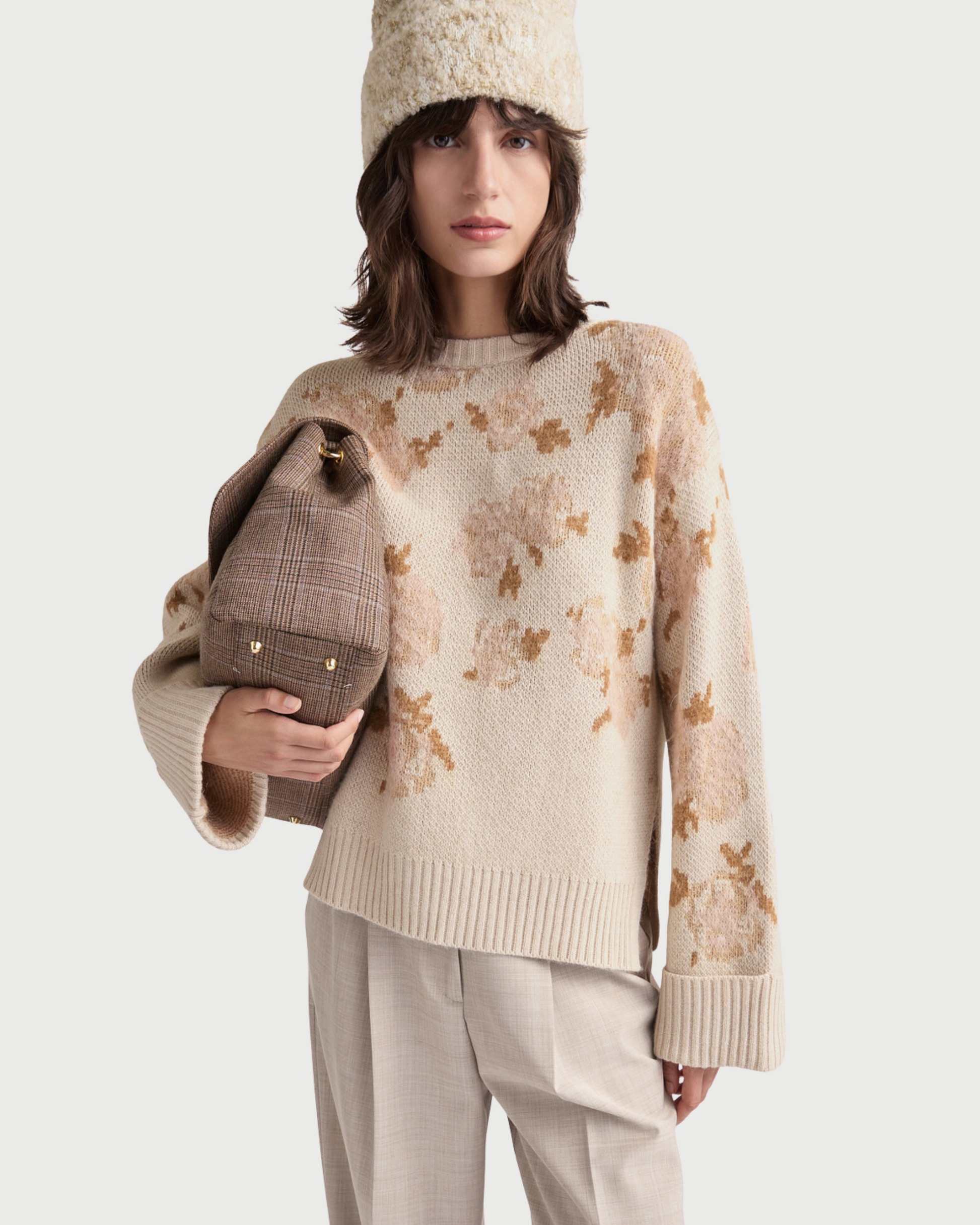 Maglione a maniche lunghe boxy in maglia piquet jaquard brusched a motivo floreale degradè.Scollo a barca in costa. Spacchi laterali finiti con dosta bassa sul davanti e costa alta sul retro.