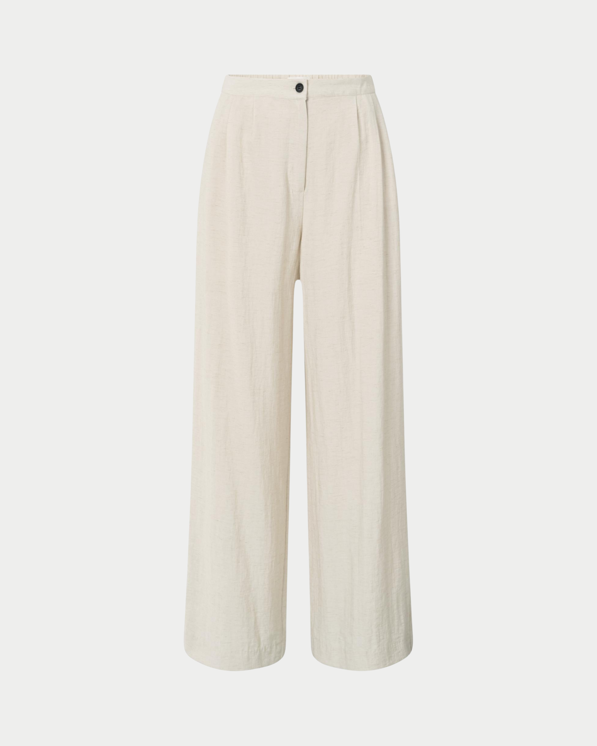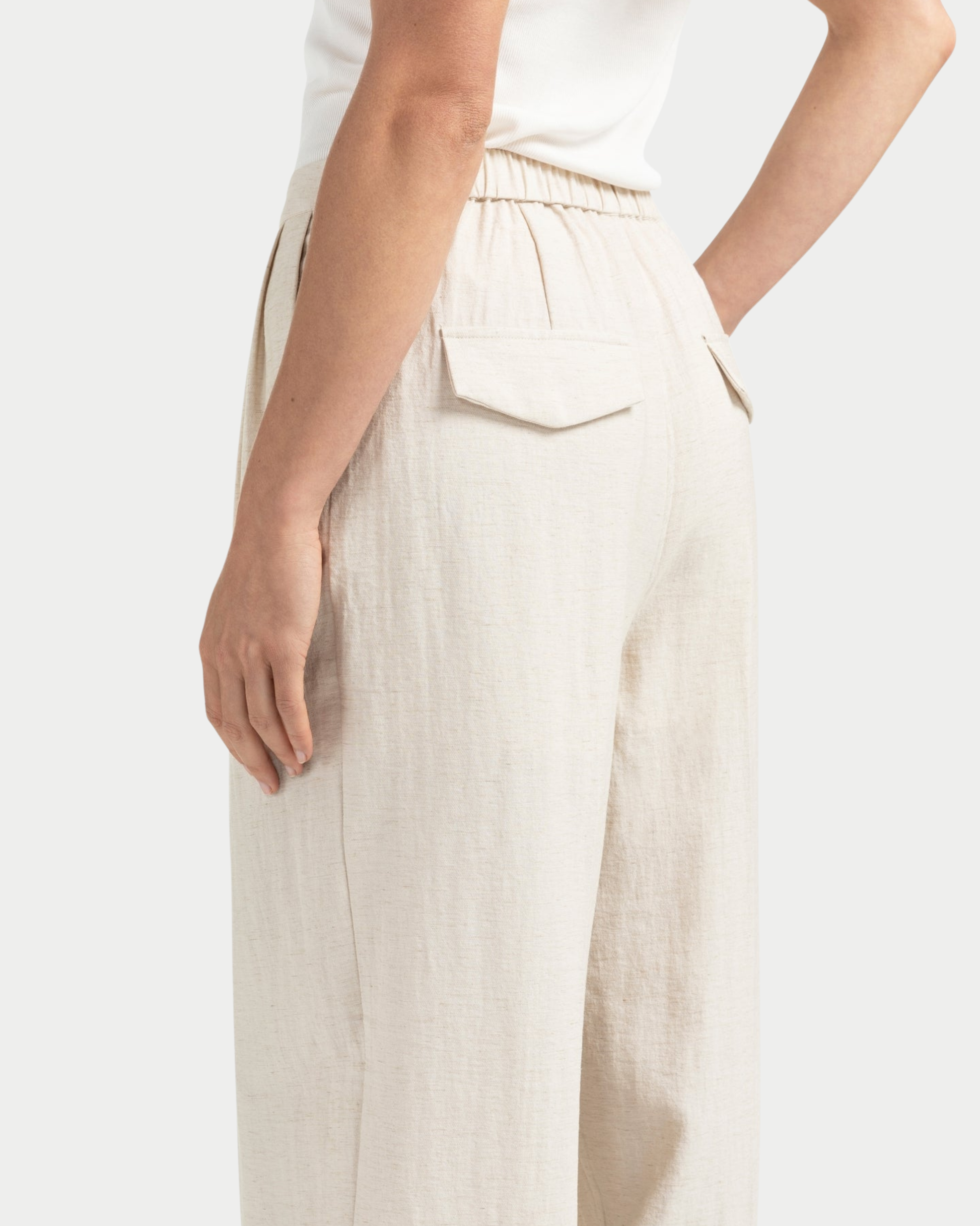 Questi pantaloni sono realizzati in un tessuto intrecciato e strutturato e presentano una vestibilità ampia con gamba dritta e larga. La vita elasticizzata garantisce comfort, mentre le pieghe frontali definiscono la silhouette. Completano il design le tasche laterali e le tasche posteriori con patta. Un capo versatile, perfetto per un look rilassato ma elegante. La modella è alta 178 cm e indossa la taglia 36.
