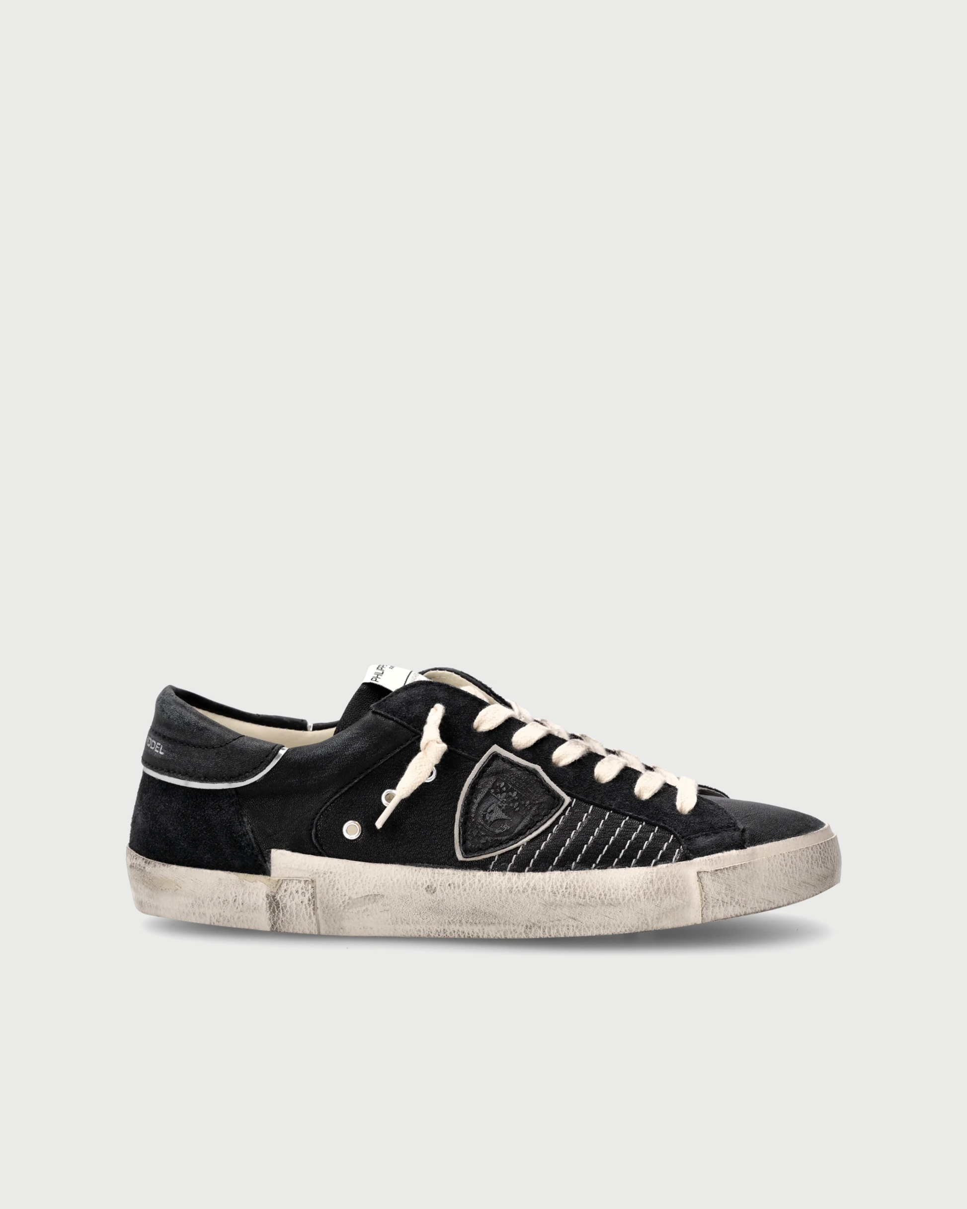 Sneaker Prsx: un'interpretazione contemporanea dello stile street degli anni '80 con l'eleganza della Costa Azzurra. La tomaia in suede e pelle nera è caratterizzata da impunture e piping a contrasto su topponcino e scudetto laterale. La suola in gomma con battistrada personalizzato e fasciatura in tessuto gommato con fresatura artigianale conferisce un effetto vissuto e autentico.