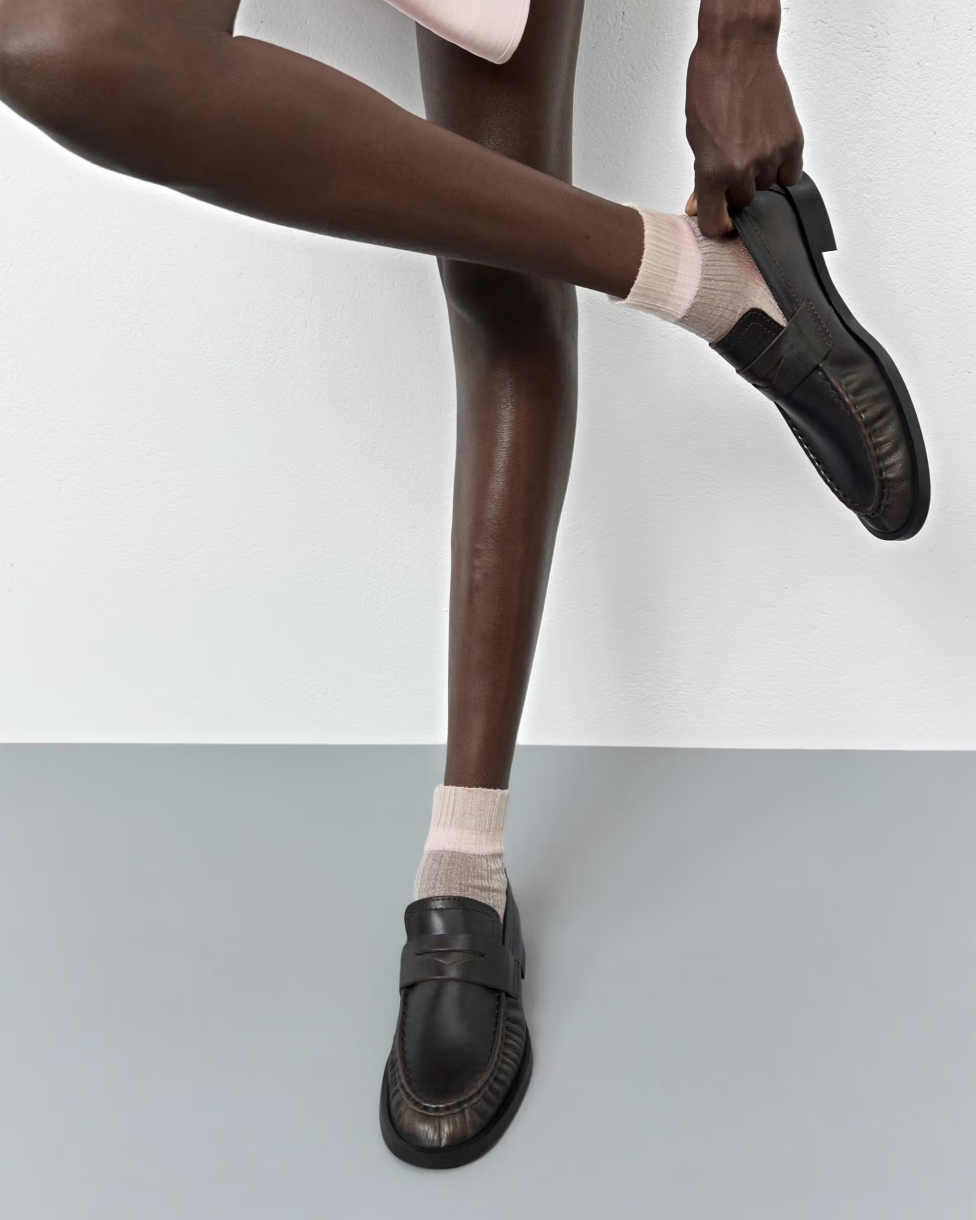 Zita unisce il penny loafer al mocassino, dando vita a una calzatura essenziale e sofisticata. La forma slim e sartoriale è definita dalla punta arrotondata arricciata e dal bordo rifinito, mentre il tacco basso in gomma garantisce comfort quotidiano.
